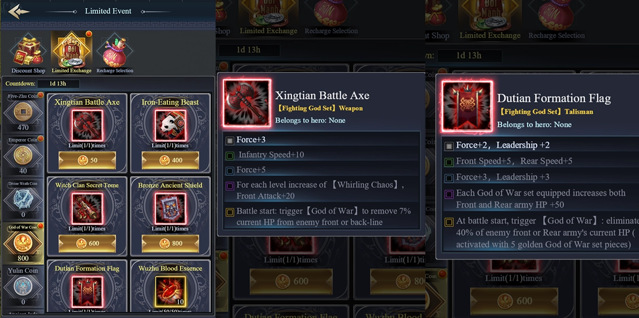 - Legendary Generals in Shop Refresh: occasionally, 3 treasure chests with 150 shards total for only 4,000 Gold (Hua Tuo, Dong Yun, Sima Hui, Yu Ji).