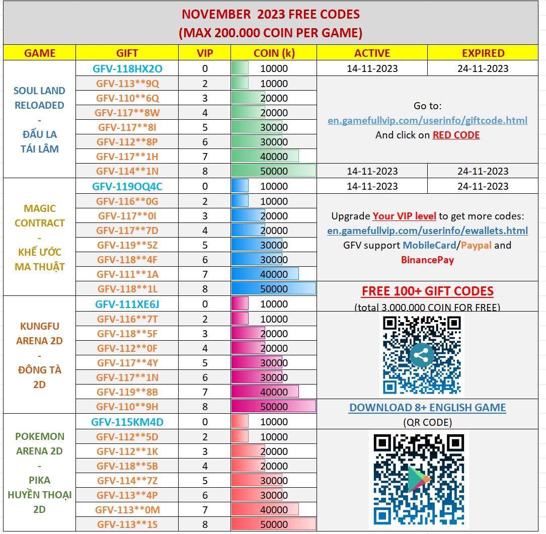 Starting NOVEMBER 2023, we will send you lots of free codes and bonuses for FREE PLAYER (VIP0)! You will receive more if you top up and increase your VIP level on the website.