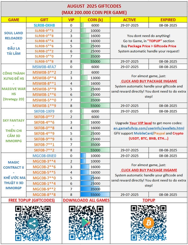 Starting July 2025, we will send you lots of free codes and bonuses for FREE PLAYER (VIP0)! You will receive more if you top up and increase your VIP level on the website.