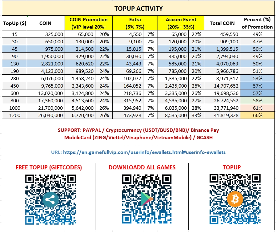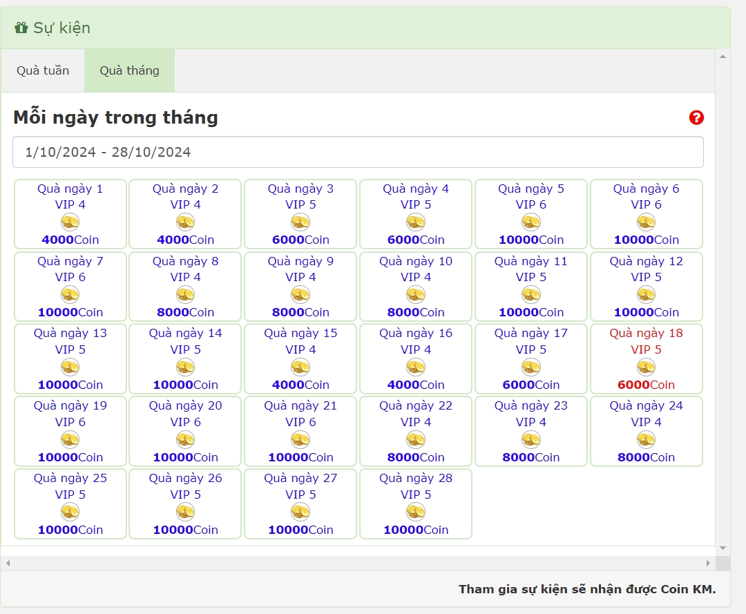 Đối với các tài khoản chưa nâng cấp VIP (VIP2 cần 50k) thì 2-3 ngày có thể nhận miễn phí COIN. Đối với VIP2+ có thể điểm danh và nhận nhiều hơn.