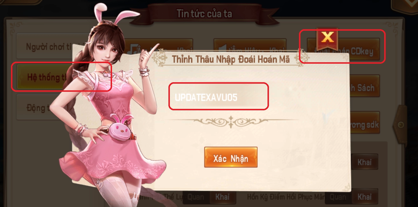 Bấm vào "AVATAR" (góc trên bên trái) >>> Hệ thống >>> Hối đoái CDkey! Nhập code và kiểm tra mail: