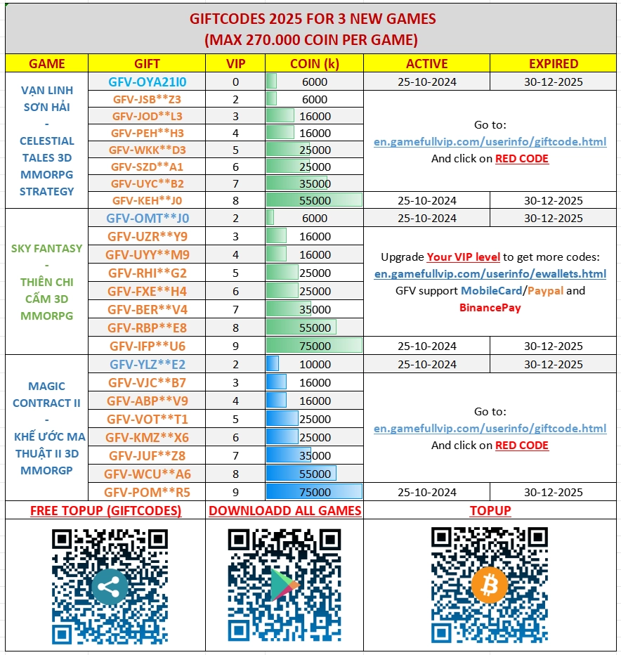 Here are the VIP Giftcodes available for VIP2 through VIP9, with a total value of up to: