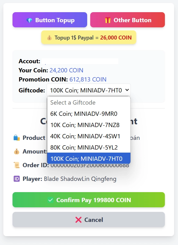 No need for gift codes. A top-up of $15 grants 4,875,000 COIN ingame, and with just $15, players can experience everything in the game.
