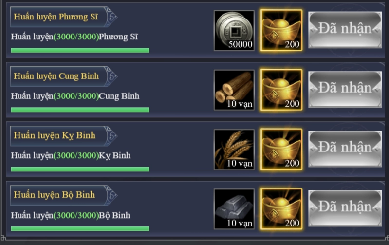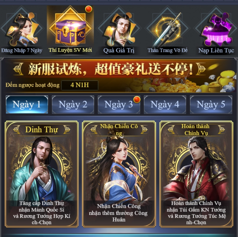 - Đăng nhập 7 ngày: nhận 10 tướng (1200 mảnh), 5,000 KNB, vô số lệnh chiêu mộ và phần quà khác (đã x10 tất cả quà)